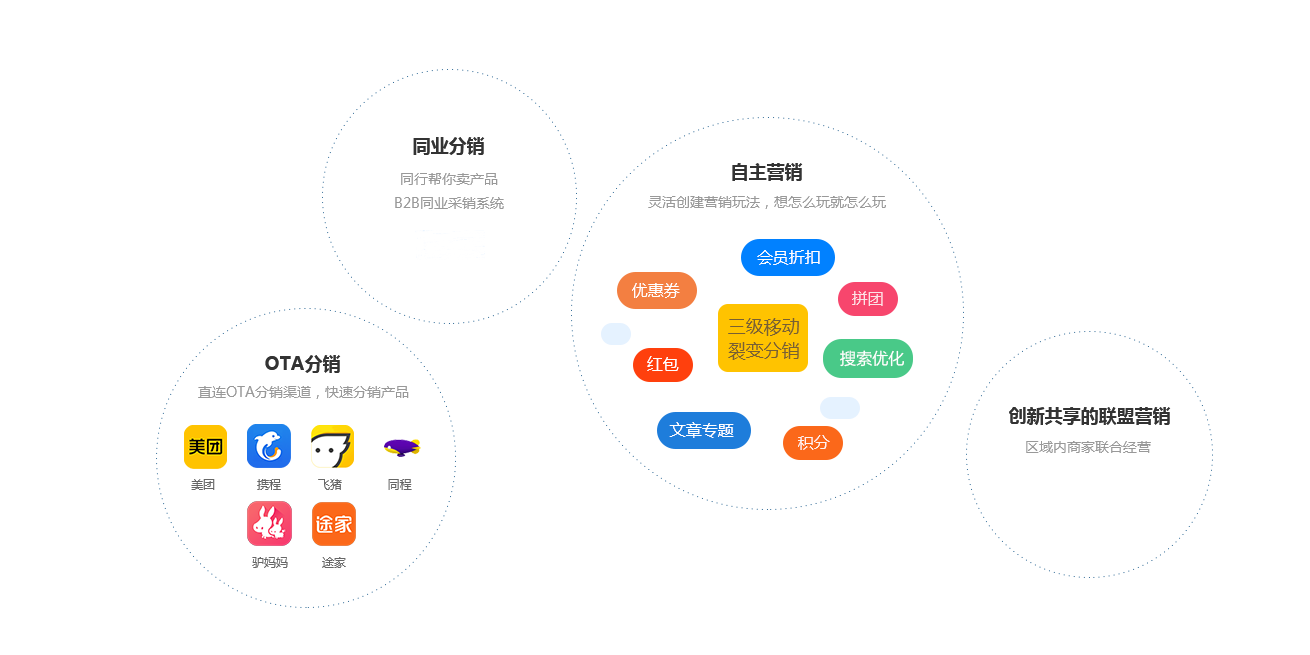 提供OTA分銷、同行渠道分銷、自主營銷玩法(移動裂變分銷、優惠劵、秒殺等)、創新共享聯盟營銷等多種營銷策略,